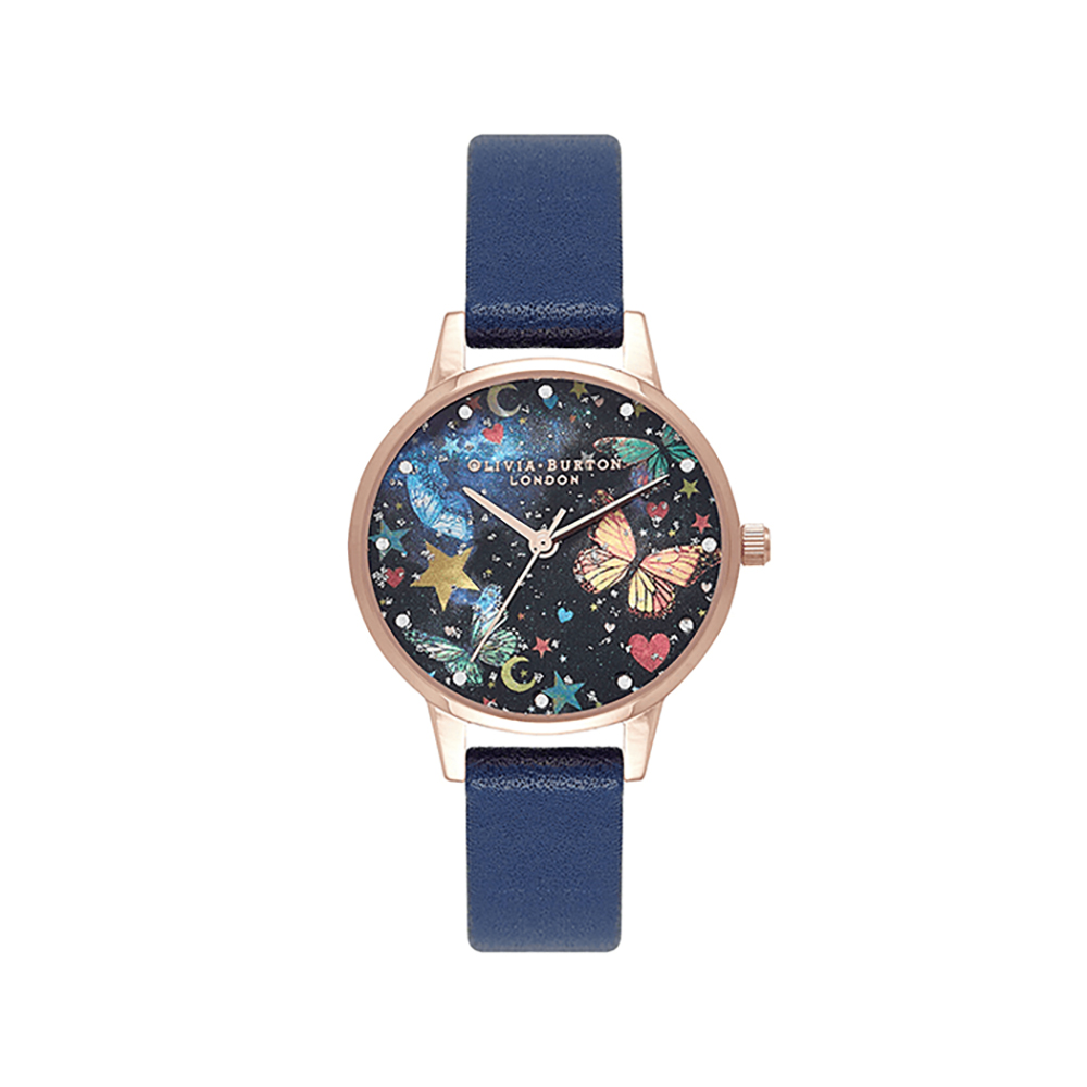 Discover the dark beauty of the Night Garden, a collection painting the secret enchantments of the natural world when the sun goes down. This style features a hypnotising 30mm midnight blue mother of pearl dial, with unexpected pops of shimmer, colourful charms and mystical butterfly motifs. Completed with a soft navy strap and gleaming rose gold case, this charmed timepiece is like a vivid dream of a distant midnight world.