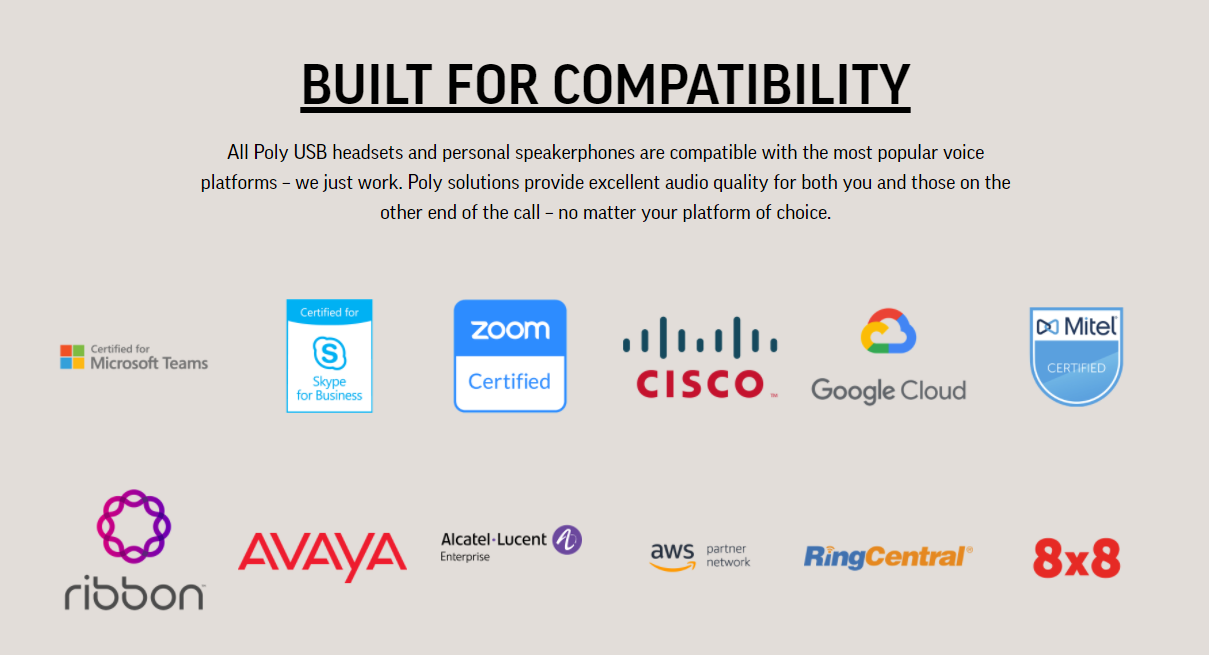 All Poly USB headsets and personal speakerphones are compatible with the most popular voice platforms – we just work. Poly solutions provide excellent audio quality for both you and those on the other end of the call – no matter your platform of choice. Compatible with Microsoft Teams, Skype for Business, Zoom, Cisco, Google, Mitel, Rubbon, Avaya, Alcatel Lucent, Amazon AWS Partner Network and many more.