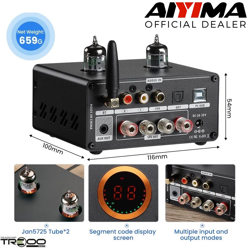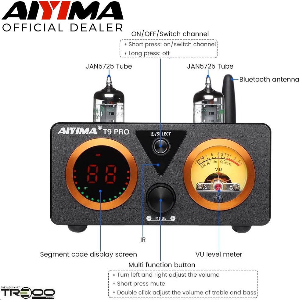 AIYIMA T9 PRO Wireless Bluetooth Receiver/Streamer, Coaxial / Optical / USB DAC & Tube Integrated Amplifier (Official local stock - SG/UK plug)