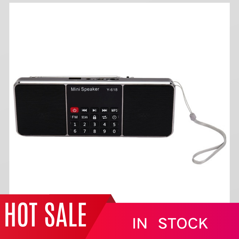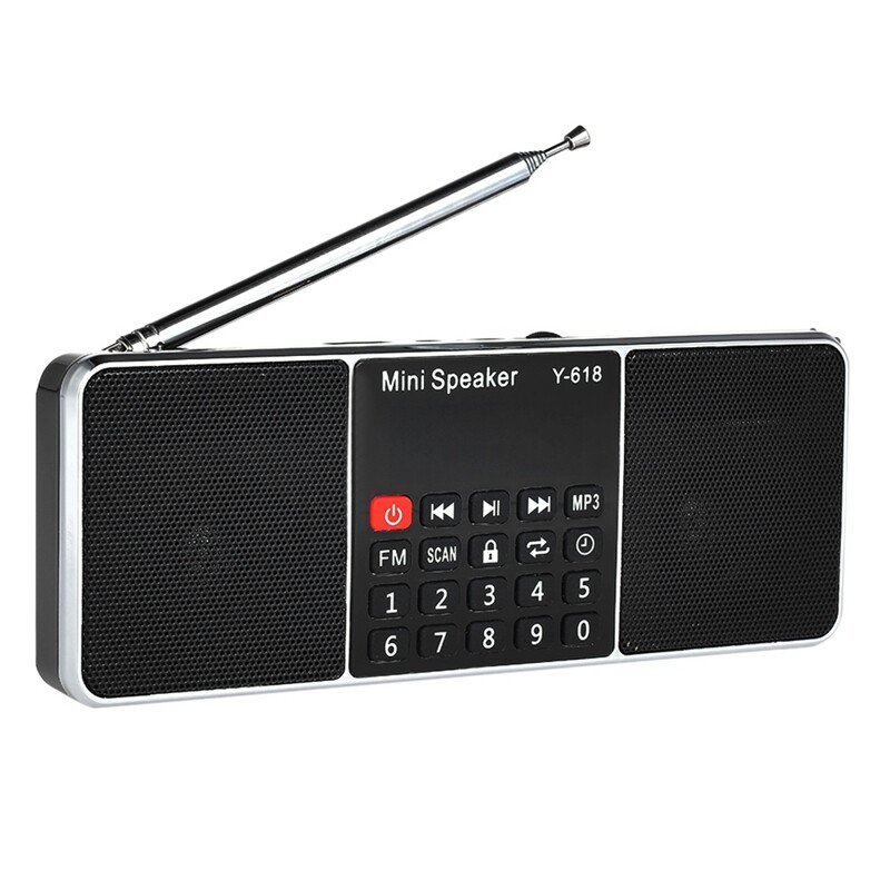 Features:[FM Radio Speaker]With high quality FM Radio signal, mini radio speaker can search channels automatically. Number buttons are for MP3 selection and FM Radio station easily. Direct manipulation and get started quickly.[High Fidelity Sound Quality]With dual 3W speakers, loud sound and high fidelity sound quality is perfectly suitable for the aged. It's also available for earphones connected with 3.5mm earphone jack.[TF / SD Card & U Drive]As a speaker, it can play music from TF / SD card and U drive. In MP3 mode, when powered off, it can playback the current MP3 when powered on next time.[Convenience]With 2 inch diaplay screen and unique plastic buttons, user-friendly, durable and eco-friendly. Lanyard design is convenient for you to take outside. And the timed shutdown function helps you in daily life.[Endurance Time]Replaceable 1000mAh battery also can be charged via included Mini USB charging cable; large battery capacity supplies long standby time, which gives you music enjoyment all the day.Y-618 Mini FM Radio Speaker is specially designed for people who are free to listen to radio, weather, and news at home. Loud sound and high fidelity sound quality makes you enjoy favorite music at anytime and anywhere. It is really cool and trendy to enjoy music with this multi-functional stereo digital speaker.Specification:Power Supply: Rechargeable Battery PackStyle: PortableScreen: YesPackage: YesBluetooth: NoMaterial: ABSWIFI: NoFunction: Built-In SpeakerType: FMModel Number: Y-618Display Screen: 2 InchFM: 87.5 MHZ-108 MHZDecoding Range: 8-320 KbpsFrequency Range: 120 Hz-20 KHzDistortion: 1.5W=1%, F=1 KHzOutput Power: 2 * 3W (max)Speaker Size: 40mm 16core internal magneticPower Input: DC 5V / 500mAOutput Impedance: 4